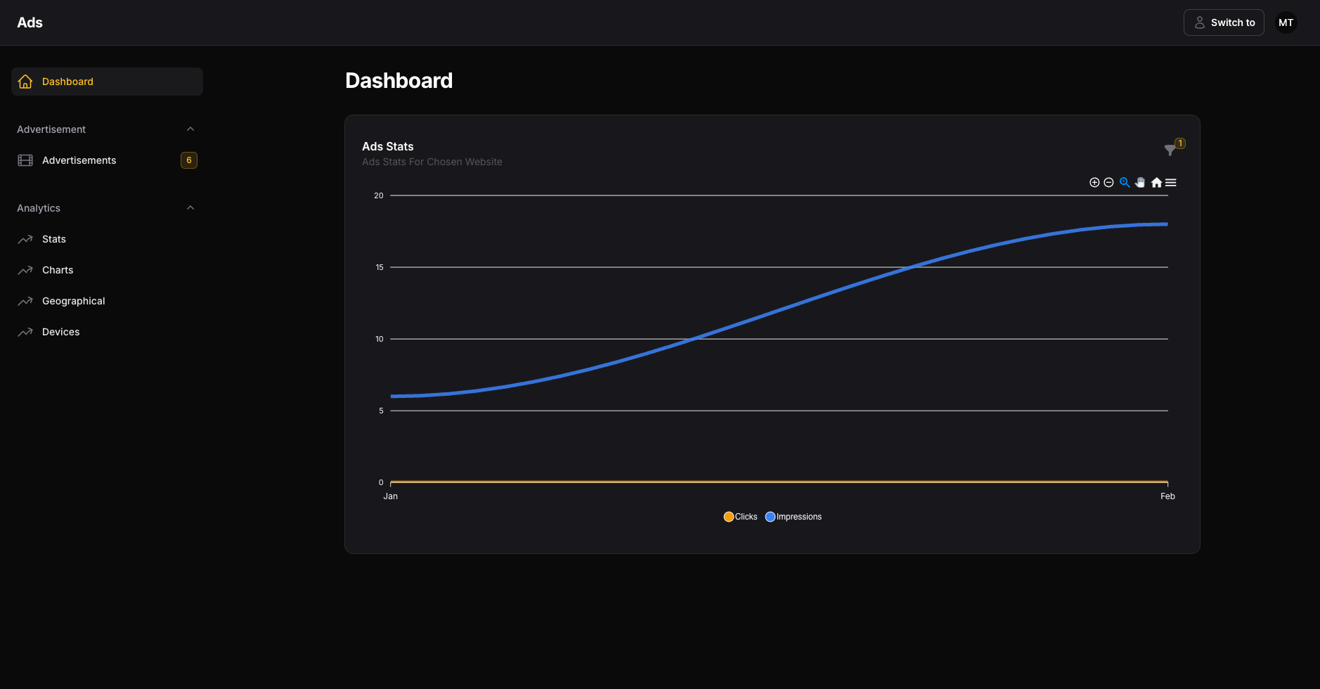 Comprehensive dashboards and charts for impressions, clicks, device types, geographies, and more—enabling data-driven decisions.